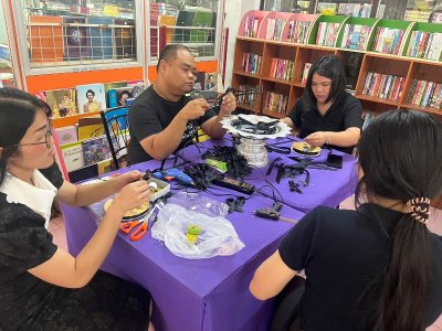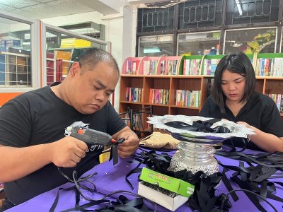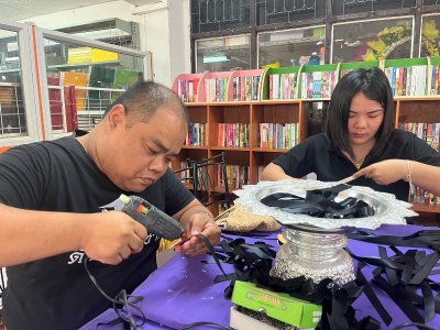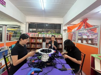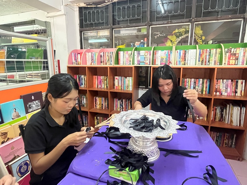 วันที่ 28 ตุลาคม 2568 เวลา 12.00 น. นางอัญรินทร์ เอื้อมอุ่นรักษ์ (ผู้อำนวยการ สกร.ระดับอำเภอพิบูลย์รักษ์) พร้อมด้วยคณะครูและบุคลากรทางการศึกษา ร่วมกันประดิษฐ์เข็มกลัดโบว์ริบบิ้นจากผ้ากำมะหยี่ สำหรับผู้ร่วมไว้อาลัย และสำนึกในพระมหากรุณาธิคุณแด่สมเด็จพระนางเจ้าสิริกิติ์ พระบรมราชินีนาถ พระบรมราชชนนีพันปีหลวง ณ ห้องสมุดประชาชนอำเภอพิบูลย์รักษ์ จังหวัดอุดรธานี
