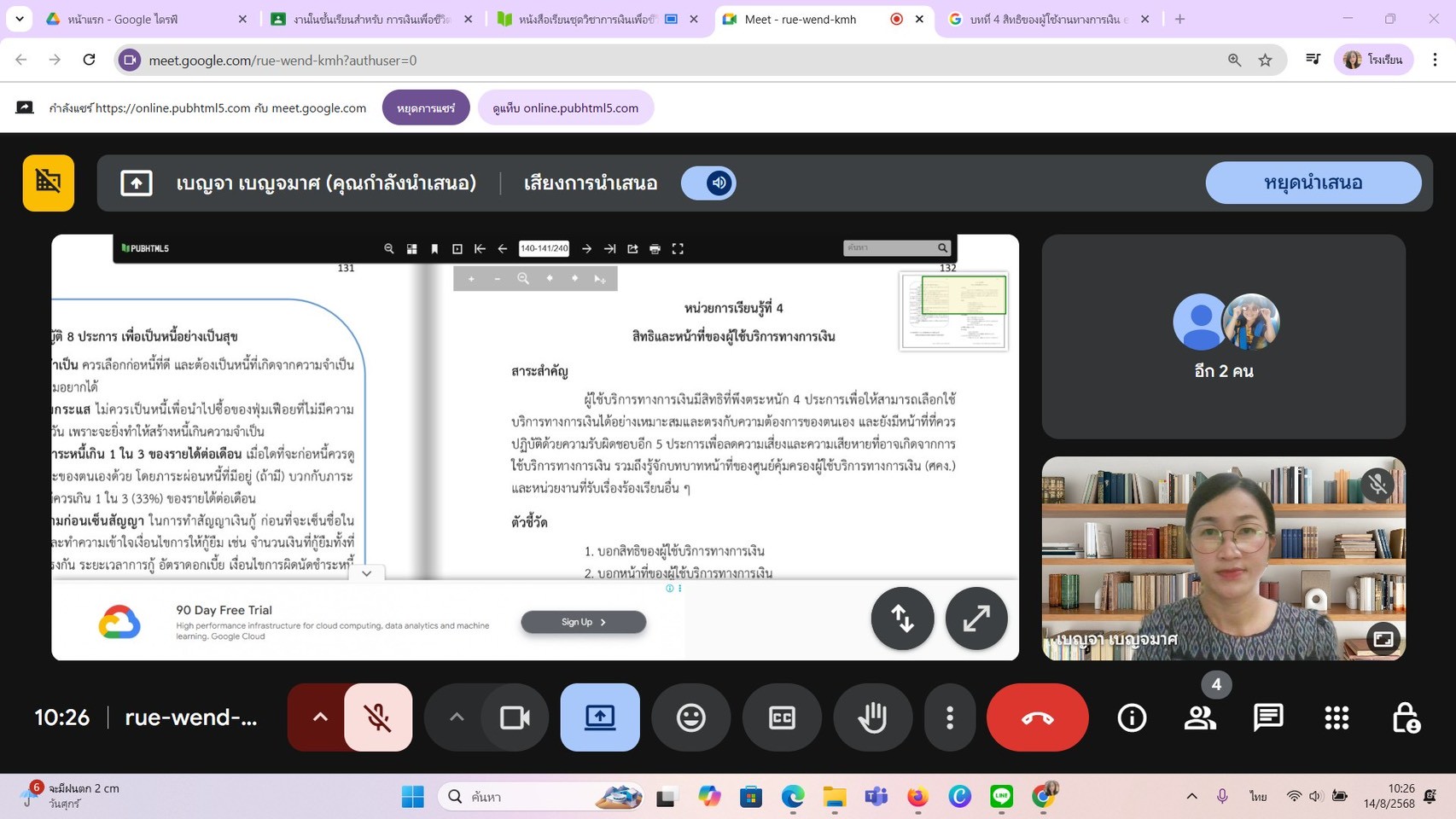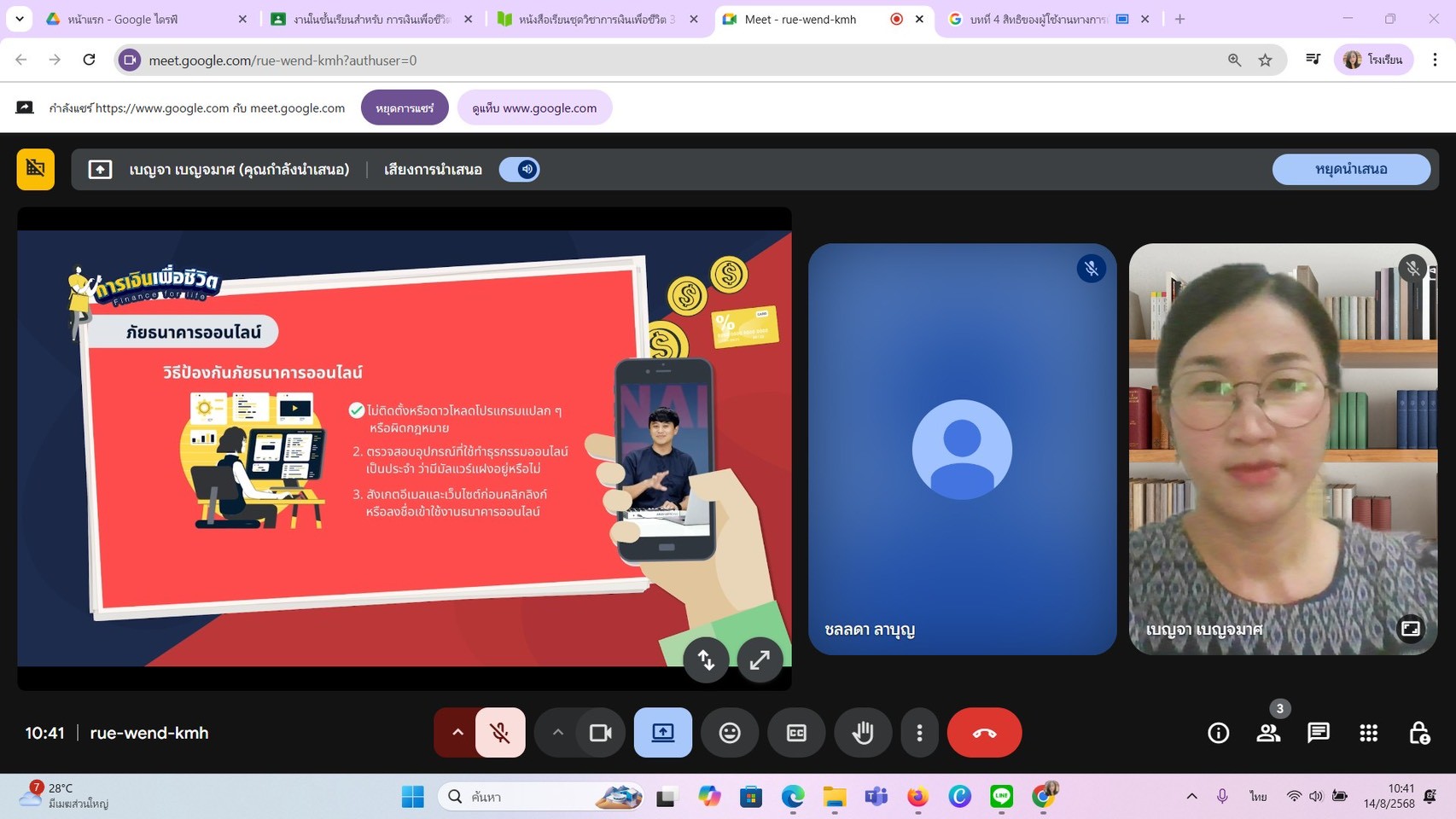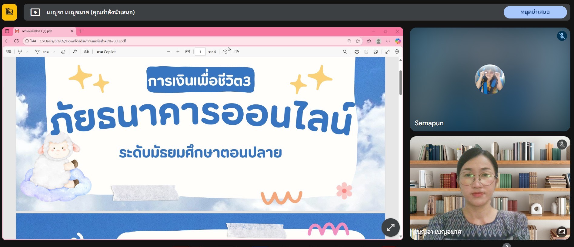 วันที่ 14 สิงหาคม 2568 นางอัญรินทร์ เอื้อมอุ่นรักษ์ (ผู้อำนวยการ สกร.ระดับอำเภอพิบูลย์รักษ์) มอบหมายให้นางสาวเบญจมาศ เลื่อนแก้ว (ครู) ดำเนินการจัดการเรียนการสอน (รูปแบบออนไลน์ผ่าน Google Meet) วิชาการเงินเพื่อชีวิต 3 ม.ปลาย หน่วยการเรียนรู้ที่ 5 ภัยการเงิน เรื่องที่ 1 หนี้นอกระบบ, เรื่องที่ 2 แชร์ลูกโซ่ ประจำภาคเรียนที่ 1 ประจำปีการศึกษา 2568 ณ ศูนย์ส่งเสริมการเรียนรู้ระดับอำเภอพิบูลย์รักษ์ จังหวัดอุดรธานี